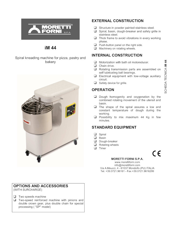 All machines have a switch-off timer, castors and safety device, necessary for maximum reliability for users. Furthermore the models iM 25, iM 38 and iM 44 are available in the version 2V with double speed and with rising head, to enable the user to work accordingly to his needs and habits.